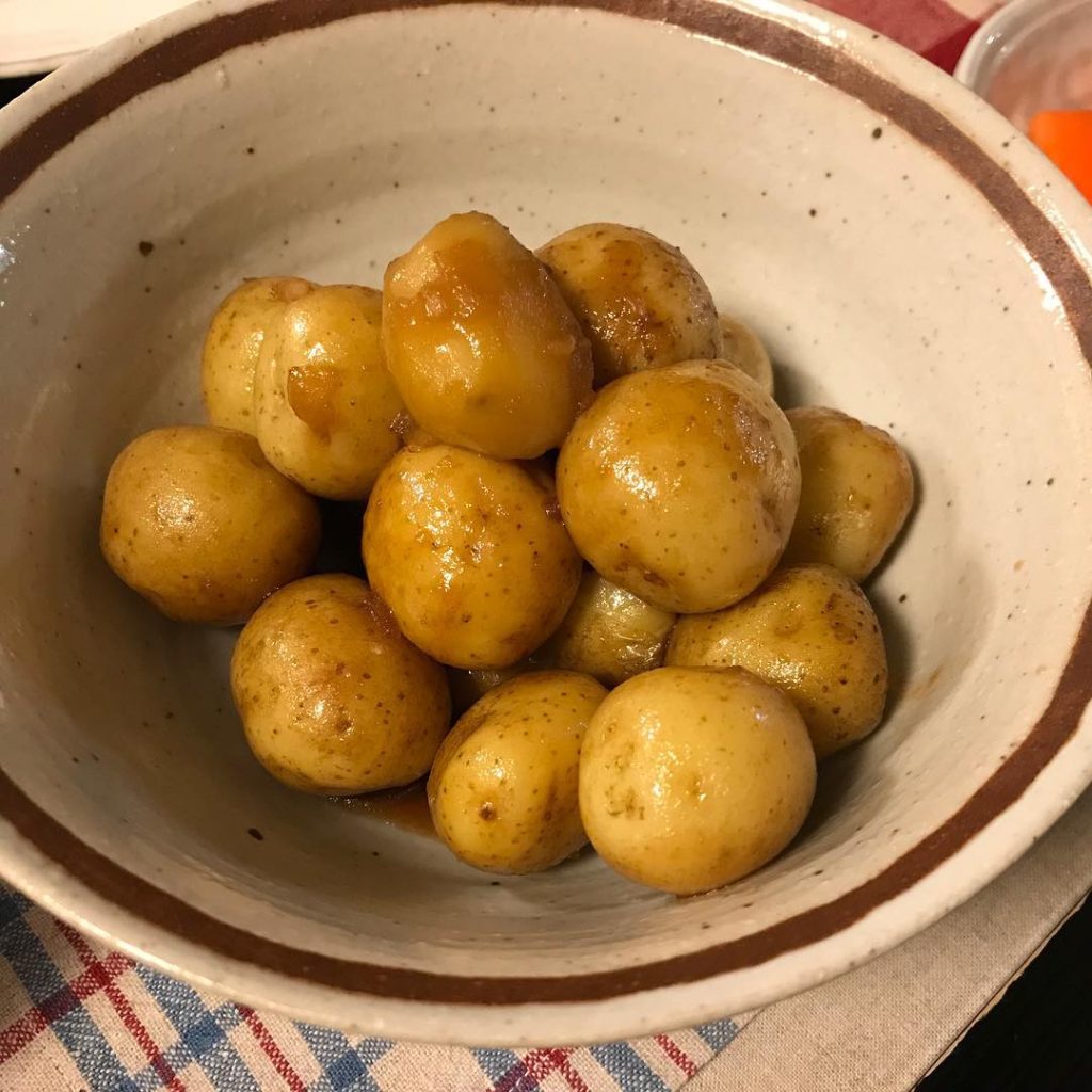蒸した新じゃがいもを砂糖と醤油で煮からめて、