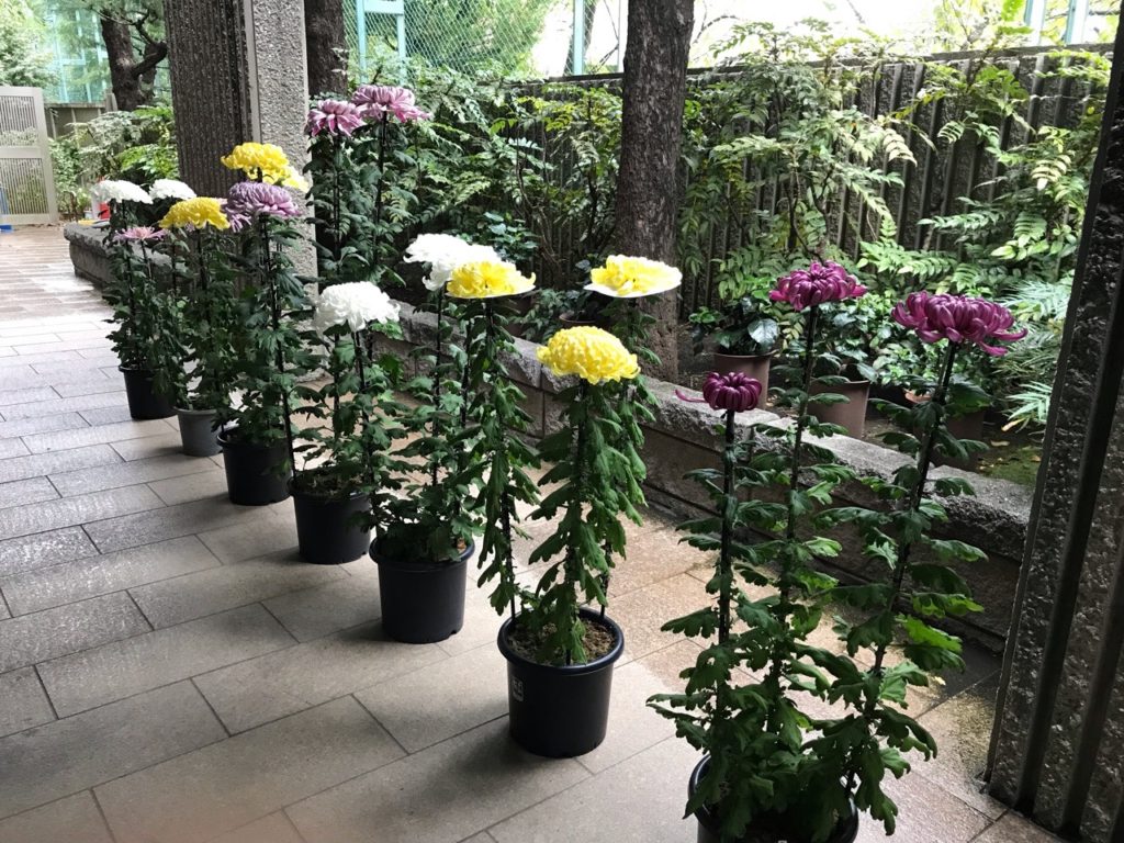 マンションの玄関前には色とりどりの菊の花が