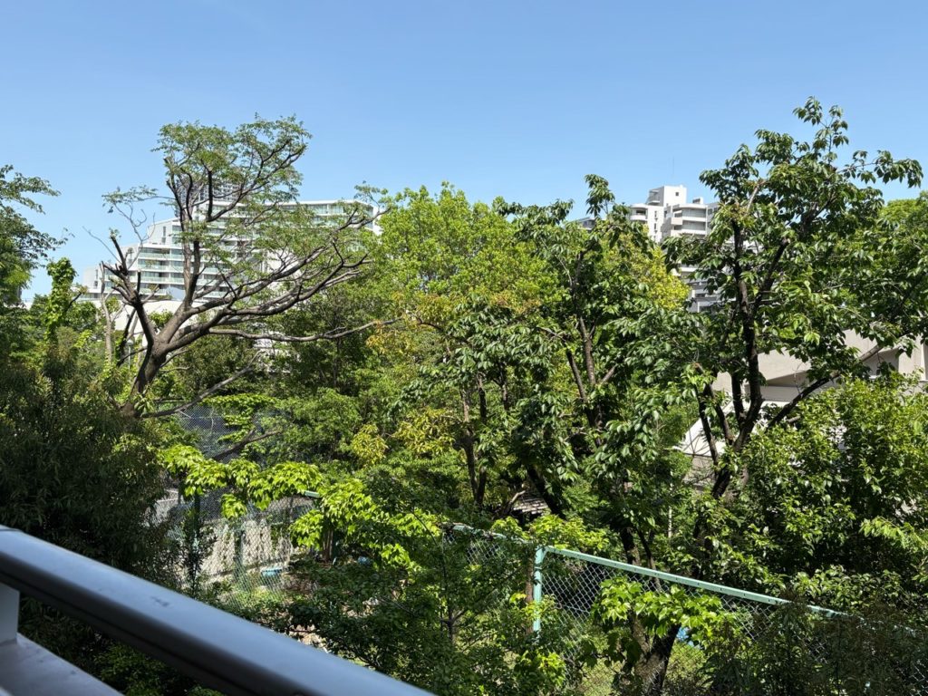 窓からは新緑が周りの建物を隠し始めて、